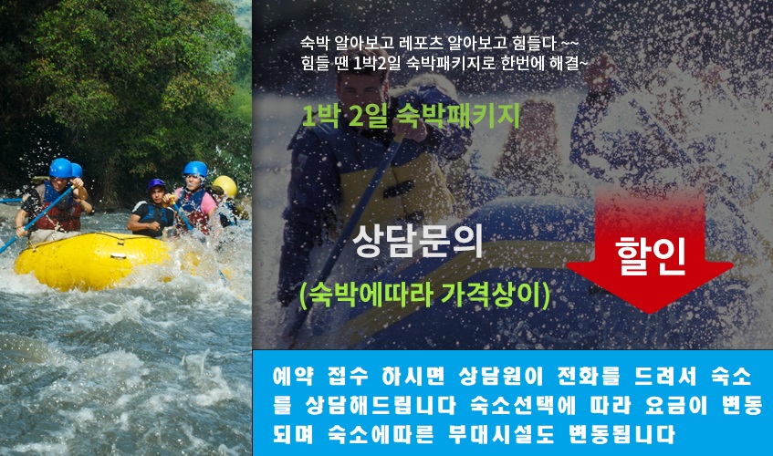 | 1박2일패키지 숙박 + 래프팅 | 상담문의 | 펜션,황토방,민박 중 선택.